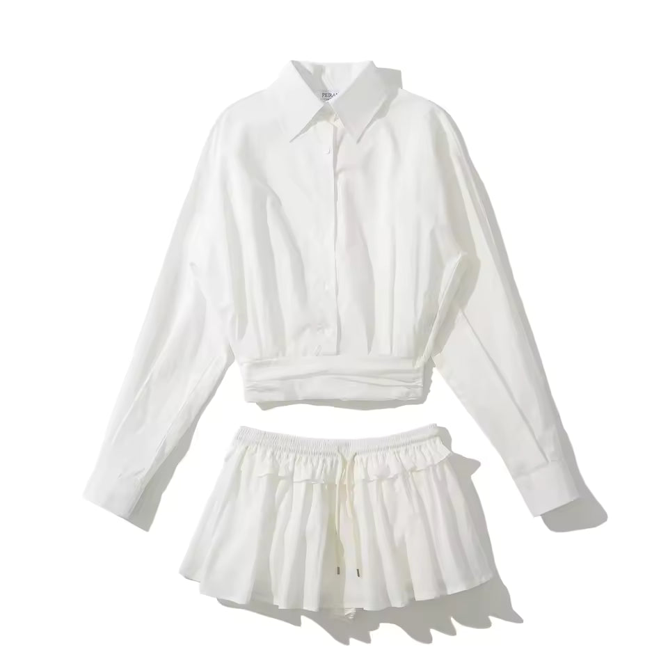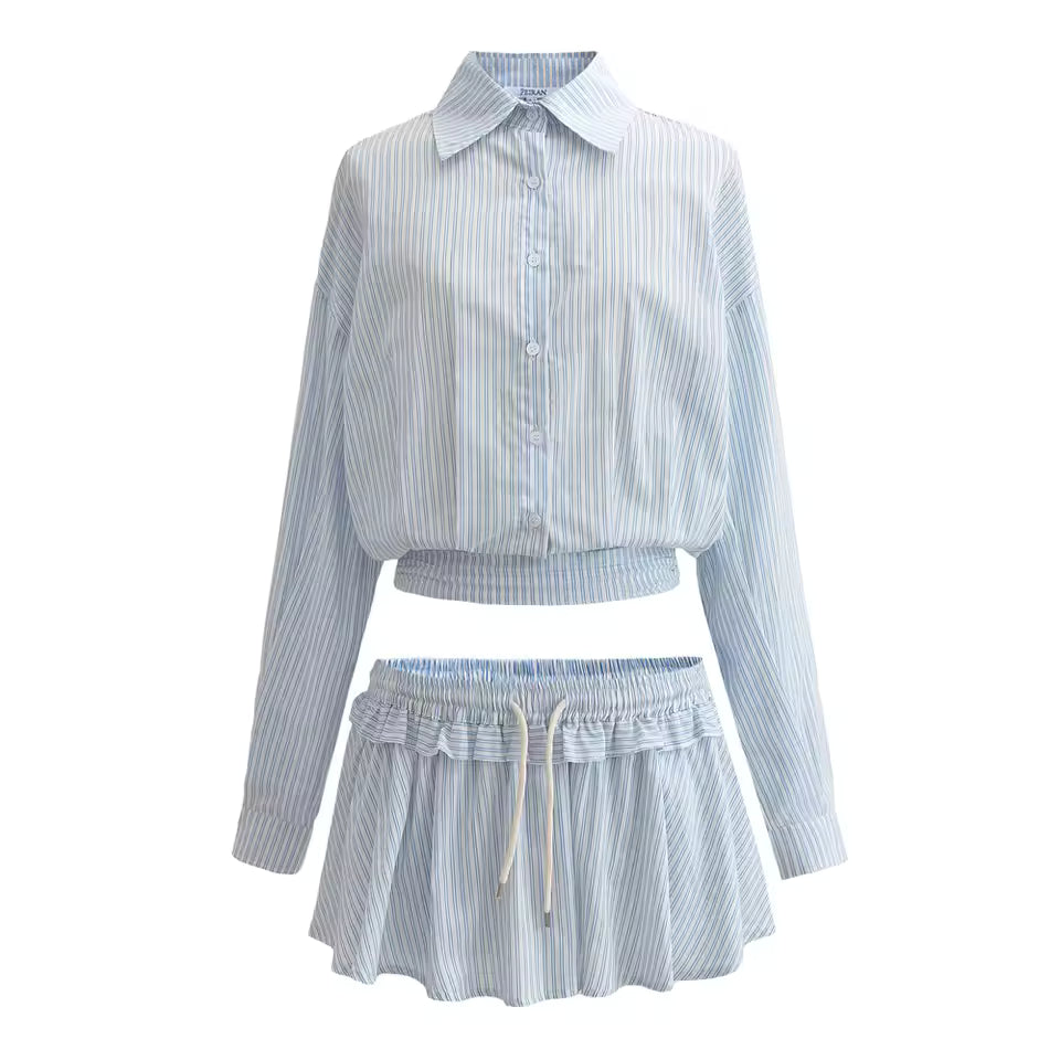 Refresh your wardrobe with the Ariella Striped Two Piece Set by Neesala Luxe, a chic and modern combination designed to elevate your everyday style. This matching set includes a relaxed lapel shirt with bat sleeves and a soft pleated mini skirt, giving you the perfect blend of comfort, structure, and elegance.