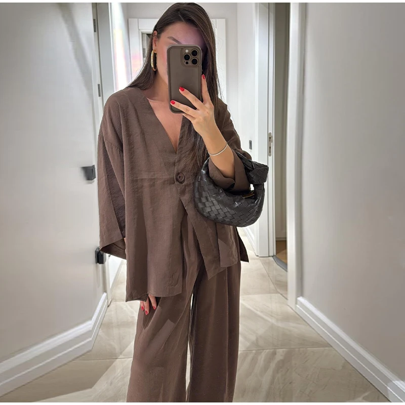 | Details | V-neckline, slim-fit trousers, clean tailored lines |