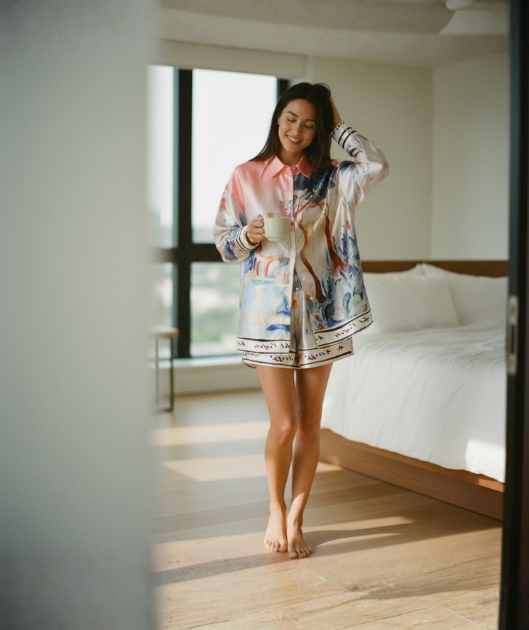 Add effortless charm to your warm-weather wardrobe with a breezy, artistic two-piece set designed for comfort and style. The Elowen Modern Minimalist Shorts Set by Neesala Luxe brings together relaxed tailoring, lightweight fabric, and a chic printed design perfect for vacations, beach days, brunch outings, or warm summer evenings.The set includes a loose, breathable button-down shirt with a classic lapel collar paired with easy-fit elastic waist shorts. The soft blended fabric drapes naturally, offering comfort and movement while keeping your look elevated and fashion-forward. Wear the pieces together for a coordinated statement or style them separately for endless summer outfits.