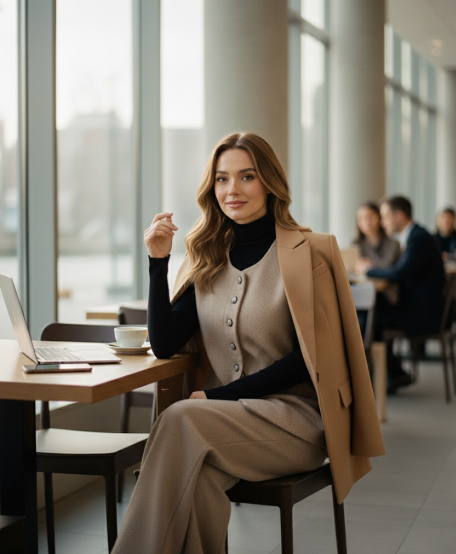 The minimalist vest drapes smoothly for a flattering fit, while the wide-leg pants offer graceful movement and a naturally elongated silhouette. Designed for comfort, refinement, and effortless styling, the Khari Set is ideal for seasonal transitions, coffee dates, office wear, or stylish city strolls.